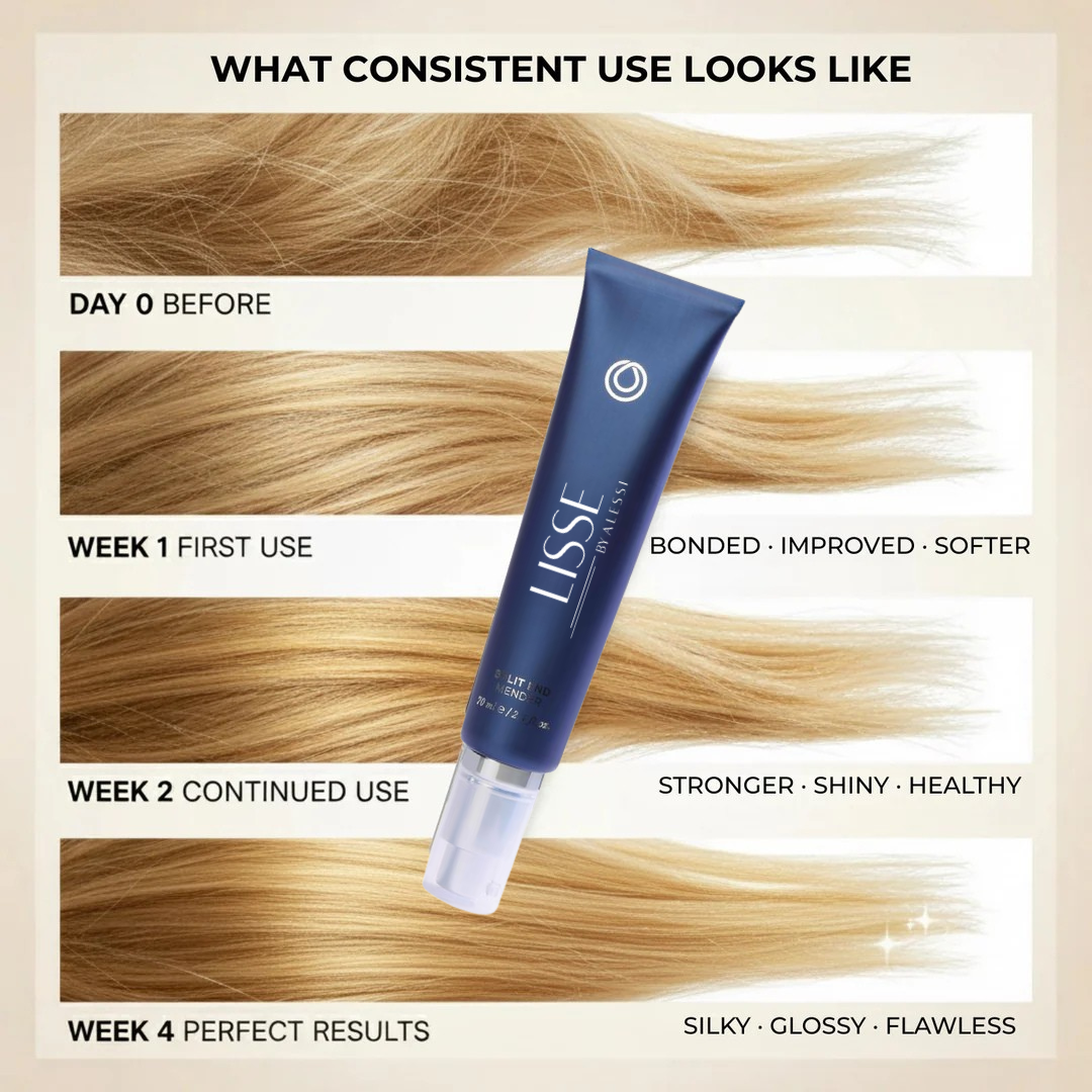 Our Split End Mending Serum works from the very first use - instantly sealing damage and restoring softness. With continued use over 2–4 weeks, it strengthens strands from root to tip, preventing new split ends before they start. The result: visibly healthier, smoother, and more resilient hair that looks freshly trimmed every day.